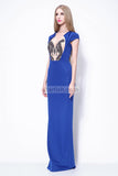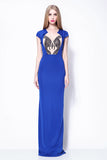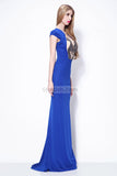 Royal Blue Cap Sleeves Beaded Column Formal Prom Dress